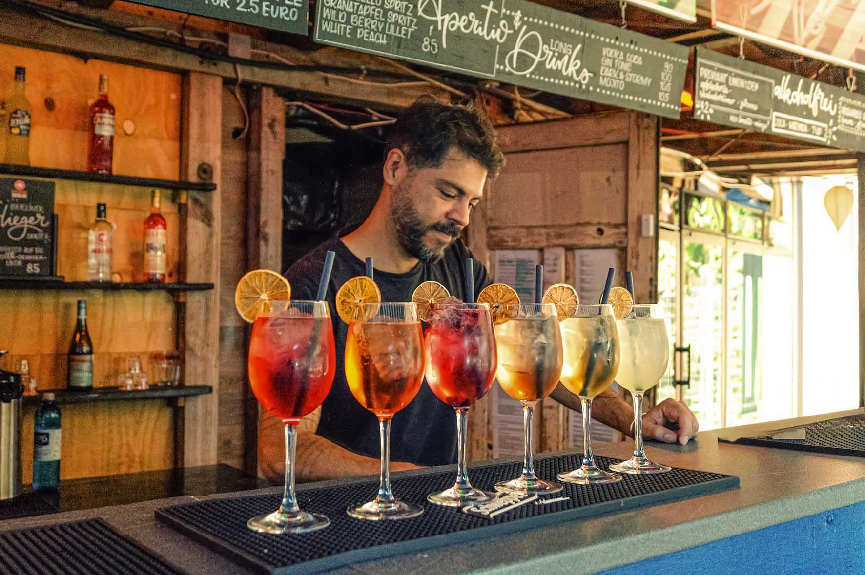 Unter Palmen sitzen, auf das Wasser schauen, ein kaltes Getränk in der Hand – und das mitten in Berlin. Unsere Strandbar serviert eiskalte Drinks und frisch gebackene Pizza aus dem Holzofen. Vor einer der schönsten Kulissen der Stadt, der Museumsinsel. Tagsüber klingt häufig Musik über die Monbijoubrücke, Musikerinnen und Musiker spielen live, spontan, nah.